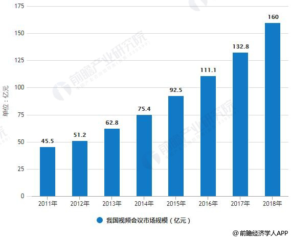在政府機關,醫療、教育、金融等領域的公共事業機構及企業需求的共同帶動下,我國的視頻會議市場呈現穩定的增長趨勢,平均年增長在20%以上。2018年我國視頻會議市場規模將達160億元左右。