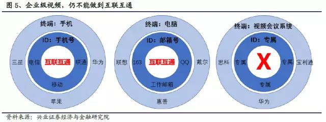 企業(yè)級視頻通信的參與方眾多,但是各家系統(tǒng)設備之間不能互聯(lián)互通是行業(yè)痛點。我們認為,要實現(xiàn)視頻會議系統(tǒng)的互聯(lián)互通,硬件廠商和運營廠商分離是前提。