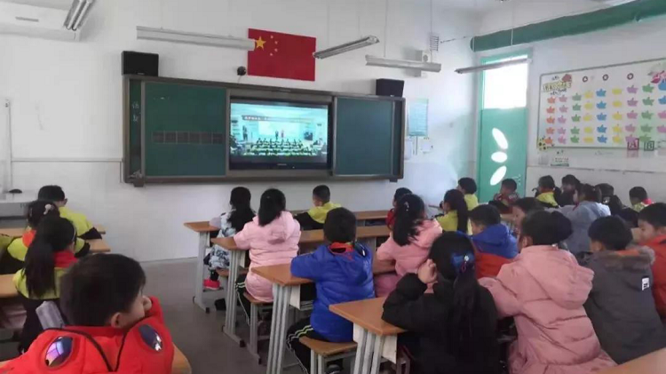 阿勒迪爾小學(xué)六年級(1)班的教室內(nèi),學(xué)生們正認(rèn)真地盯著電子屏幕中講課的老師。阿克蘇市第二小學(xué)語文老師徐哲正通過遠程直播教室大屏幕,與本班及1公里之外的阿勒迪爾小學(xué)六年級(1)班的學(xué)生們互動,課堂氣氛活躍而有趣。