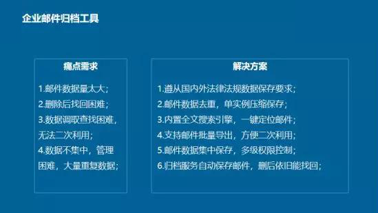 每個人的郵箱中都有成千上百條重要的信息往來,萬一丟失、誤刪某一條信息想要找回就變得非常困難,因此需要一種找到所需信息的簡單方法。我們的本地歸檔產(chǎn)品遵從國內(nèi)外法律法規(guī)數(shù)據(jù)保存要求,可作為企業(yè)郵件歸檔和數(shù)據(jù)備份工具,內(nèi)置全文搜索引擎,一鍵定位郵件。支持備份全域郵件,可隨時恢復(fù)、還原和遷移。