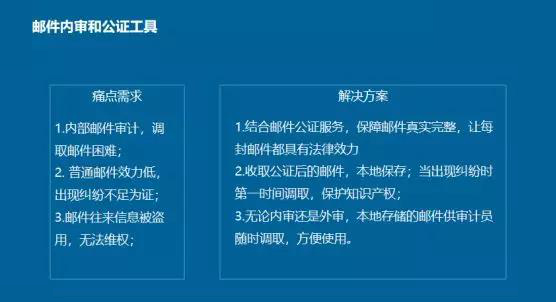 電子郵件的審計和公證對于中小企業(yè)來說需求并不強烈,但對于大型國企客戶、行業(yè)領(lǐng)軍名企、政府機關(guān)、事業(yè)單位等來說卻是剛需。尤其在涉密單位,往往因為內(nèi)部某些人員的疏漏而導(dǎo)致商業(yè)糾紛、泄露私密材料等嚴重的信息安全問題。然而電子郵件很容易被篡改和刪除,很難直接作為司法證據(jù)。企業(yè)郵箱本地歸檔產(chǎn)品對出入域郵件進行全面監(jiān)控,并且與國內(nèi)權(quán)威公證機構(gòu)合作,可直接進行公證,讓每封郵件都具有法律效力,幫助企業(yè)客戶保護知識產(chǎn)權(quán),規(guī)避風(fēng)險。